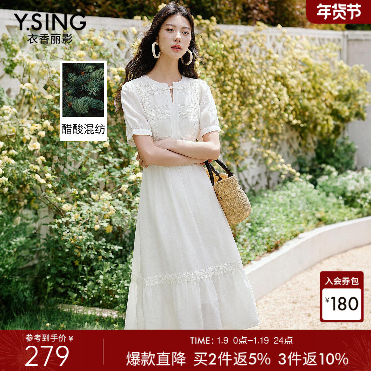 衣香丽影新中式醋酸连衣裙女2025年夏季新款国风盘扣白色蕾丝裙子