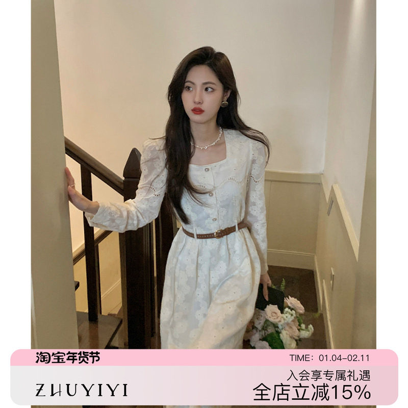ZHUYIYI 法式高级感超春款连衣裙女新款收腰刺绣白色蕾丝裙开春