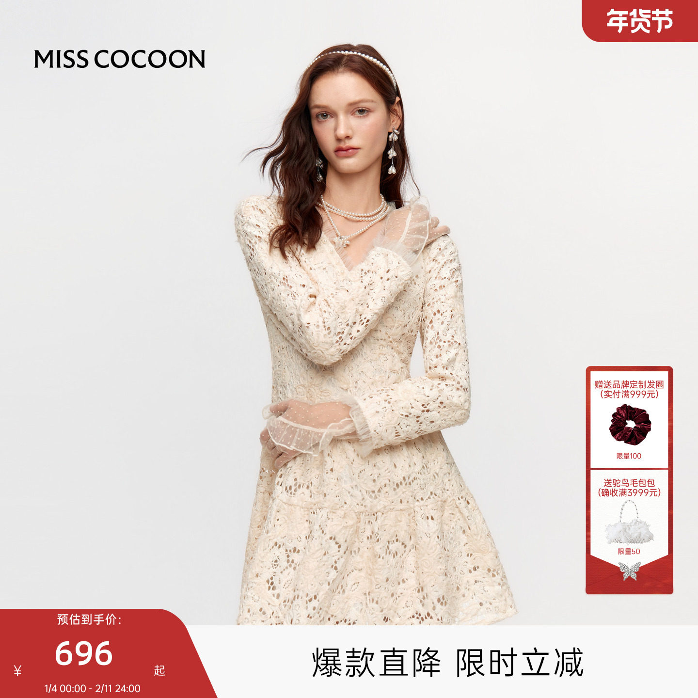 MISSCOCOON可可尼白色蕾丝裙子女2025冬季新款镂空V领显瘦连衣裙