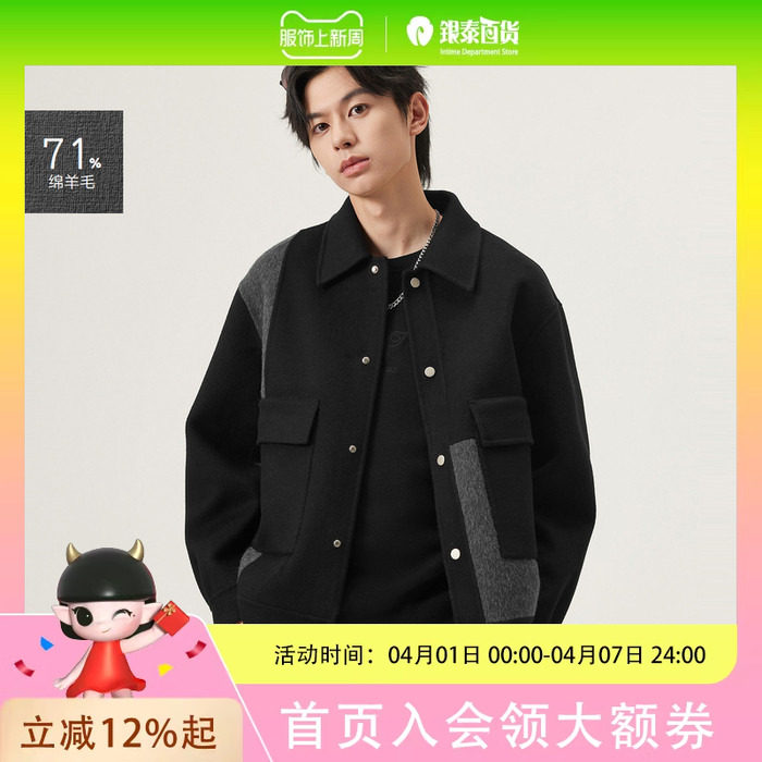 GXG男装 黑色拼接设计时尚高级短款大衣外套男士 24年冬季品