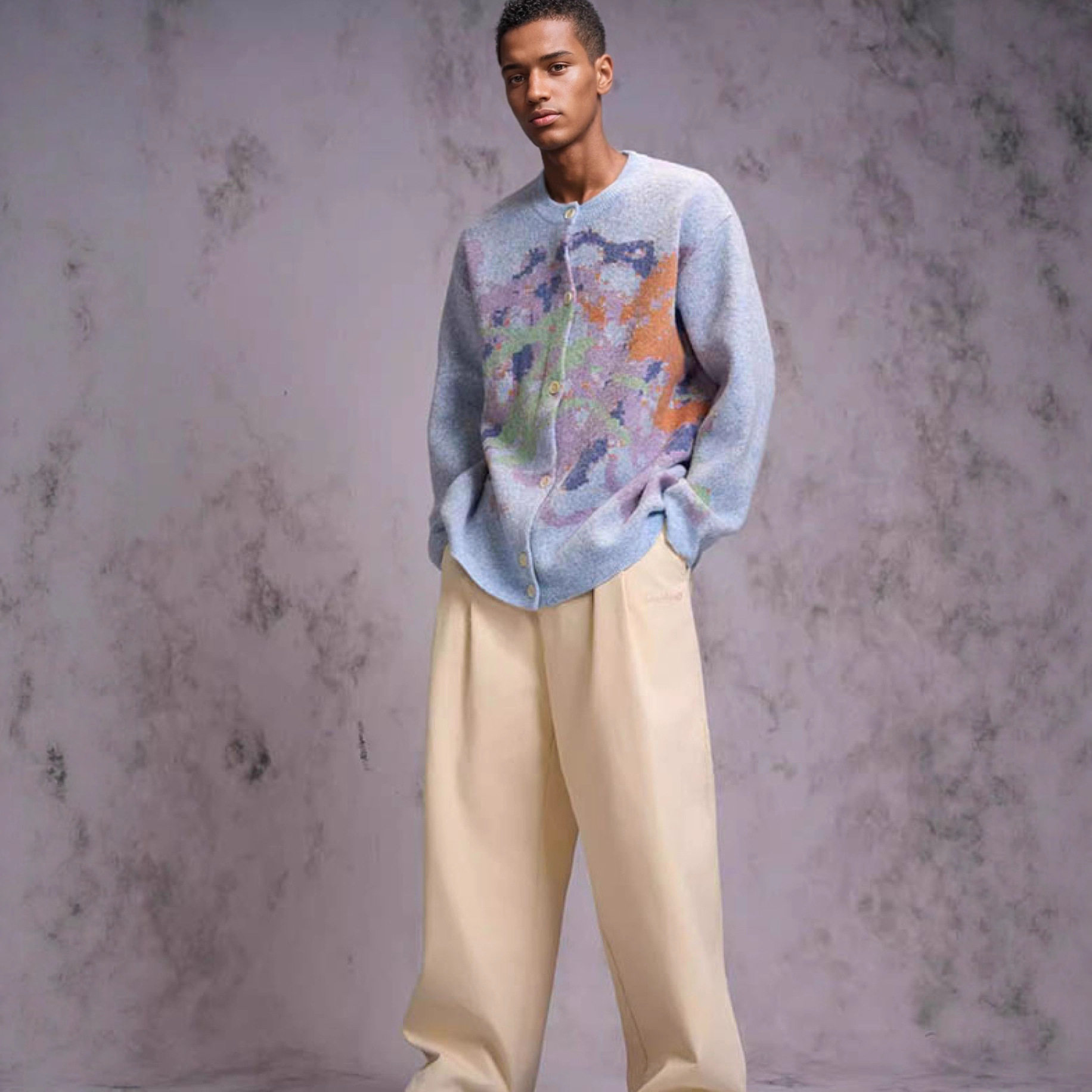 陈明星同款蜡笔风提花涂鸦设计秋冬毛衣开衫男女同款外套针织毛衫