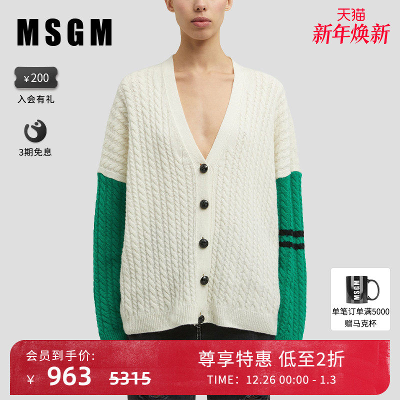【明星同款】MSGM女士V领单排扣撞色外套羊毛针织开衫毛衣上衣