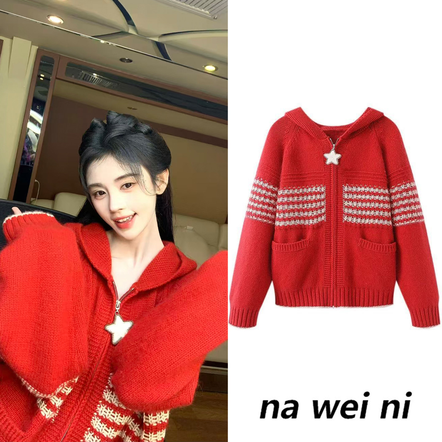 鞠婧祎同款新年圣诞红色星星拉链针织开衫女2026秋冬连帽毛衣外套