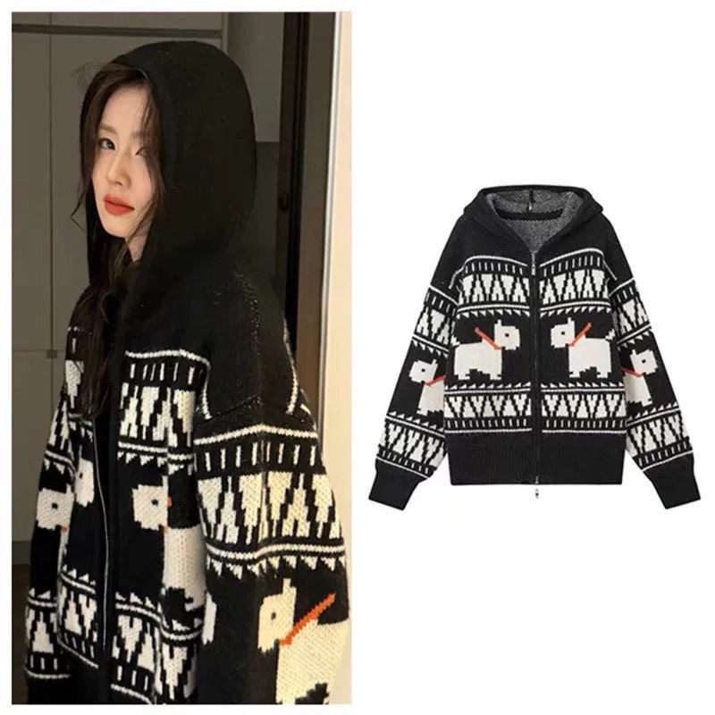 赵露思同款小熊连帽针织开衫女2025秋冬新款绞花拉链毛衣外套上衣