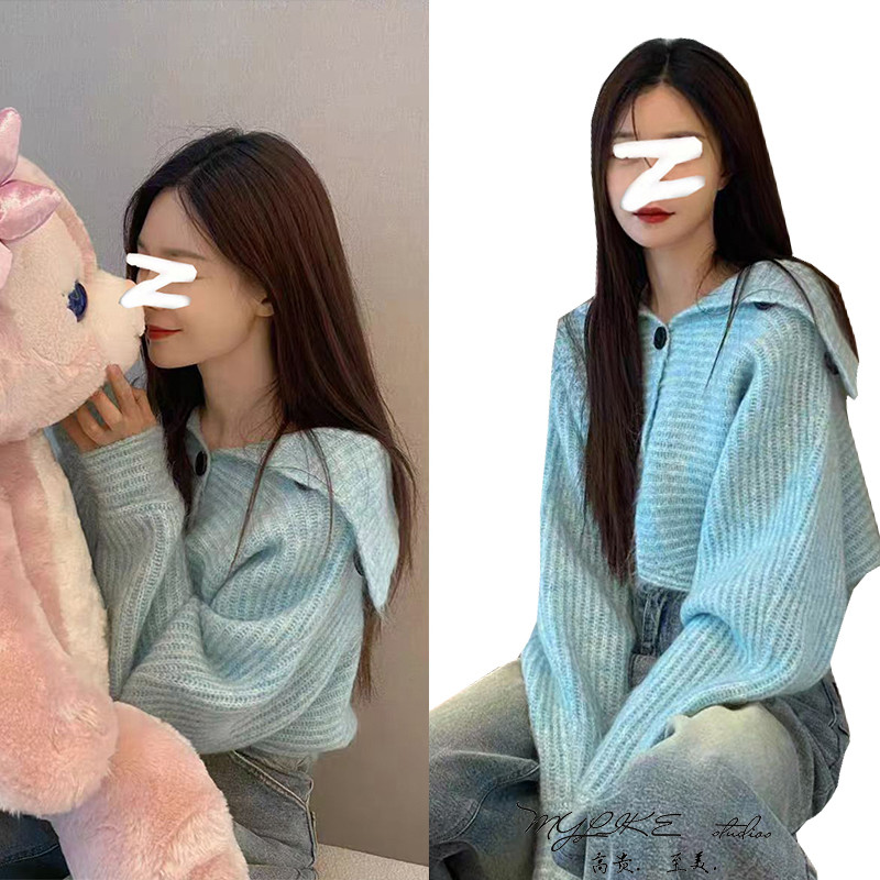 明星同款海军领阴霾蓝气质可甜可盐毛衣外套百搭轻奢设计针织衫女