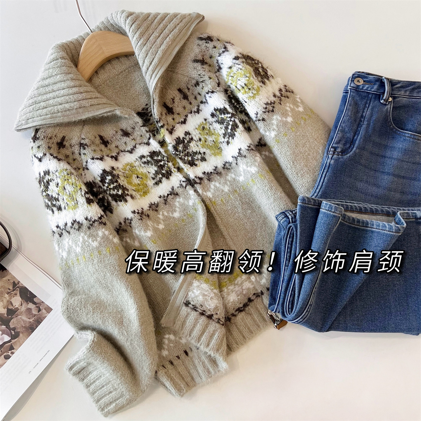 明星同款!SW家费尔岛提花大翻领羊毛针织开衫双拉链毛衣外套女冬