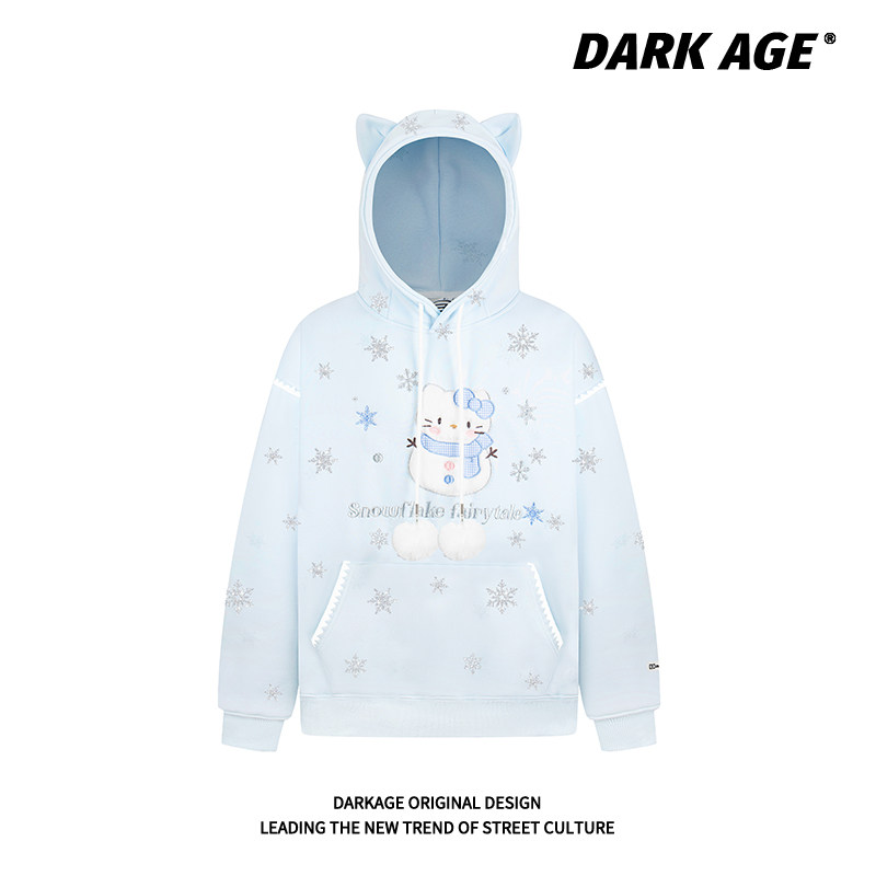 DARKAGE原创美式刺绣雪人猫耳连帽卫衣女秋冬春季情侣装宽松外套