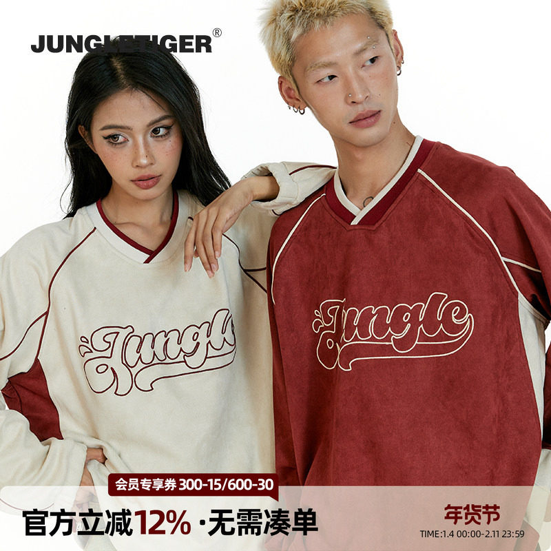 丛林老虎美式字母刺绣V领麂皮绒卫衣男女2026春季潮牌情侣装上衣