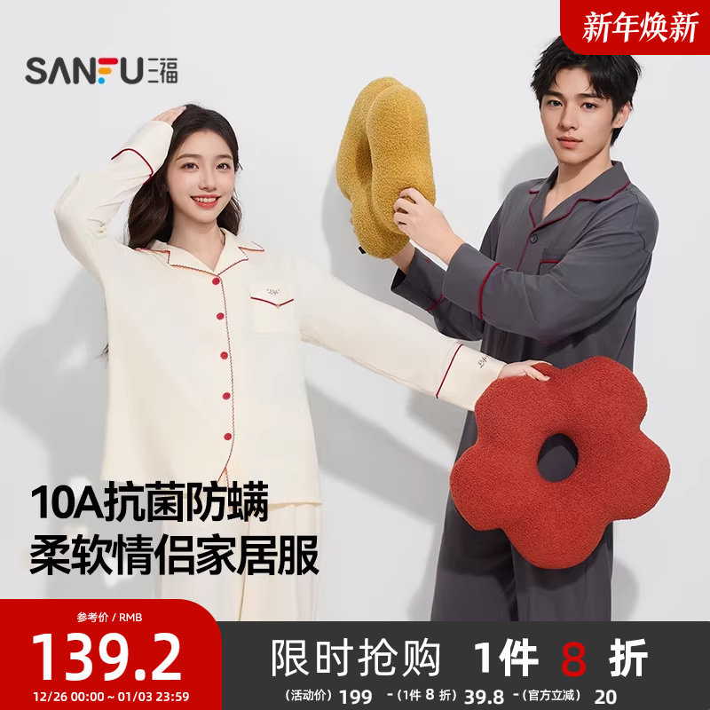 【抗菌防螨】三福2026春季情侣装长袖睡衣女套装宽松棉质男家居服