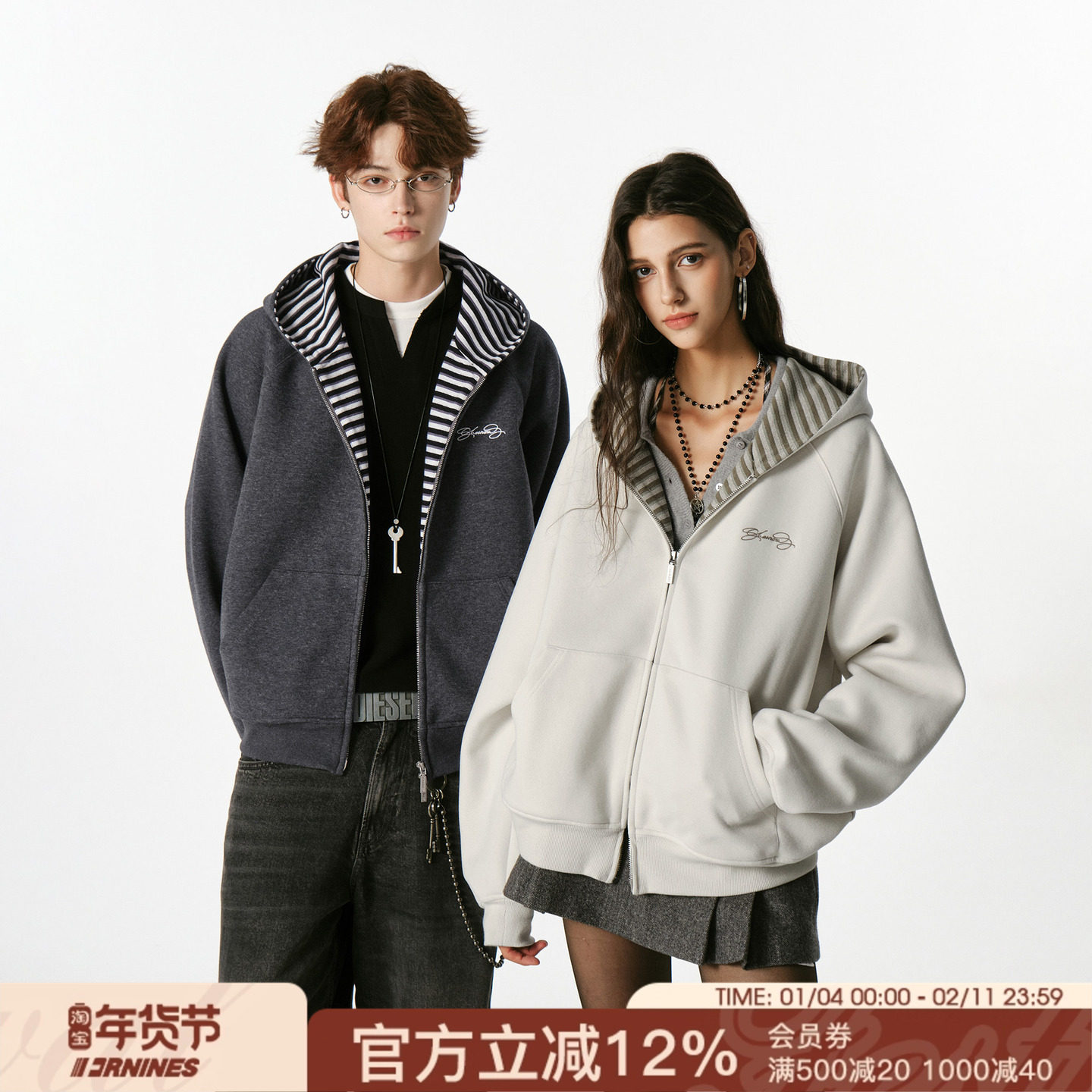 FORNINES条纹拼接刺绣连帽卫衣男女情侣装上衣双拉链开衫春季外套