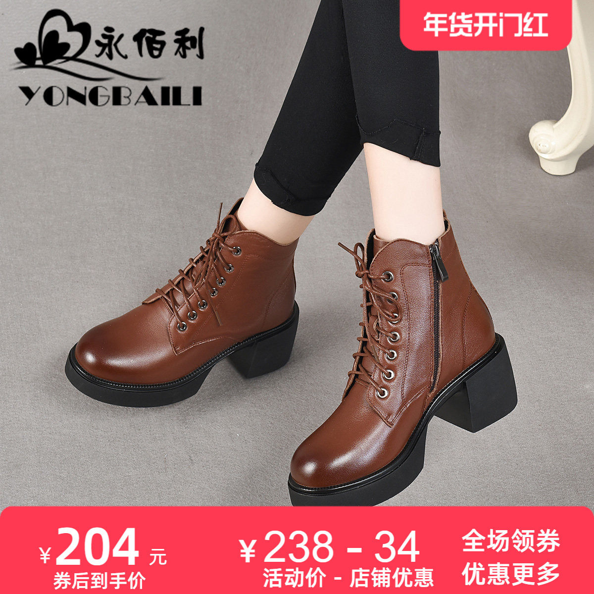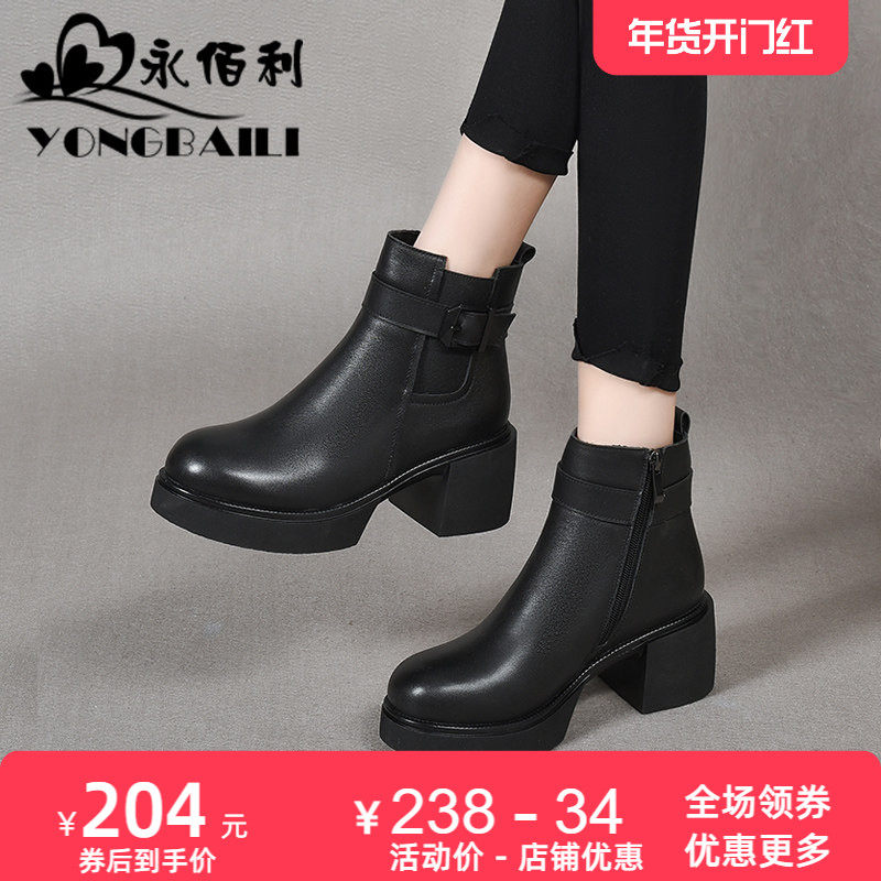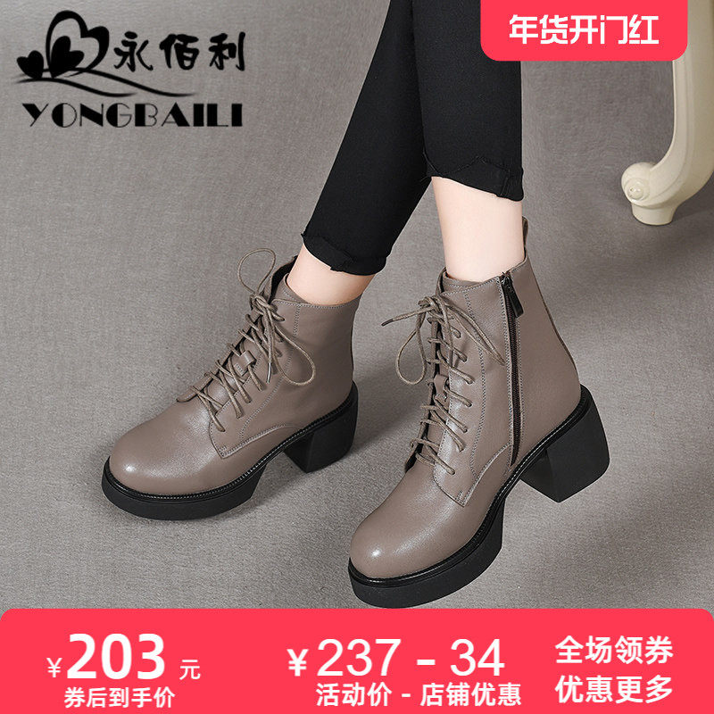 - 粗跟高跟马丁靴 真皮短靴