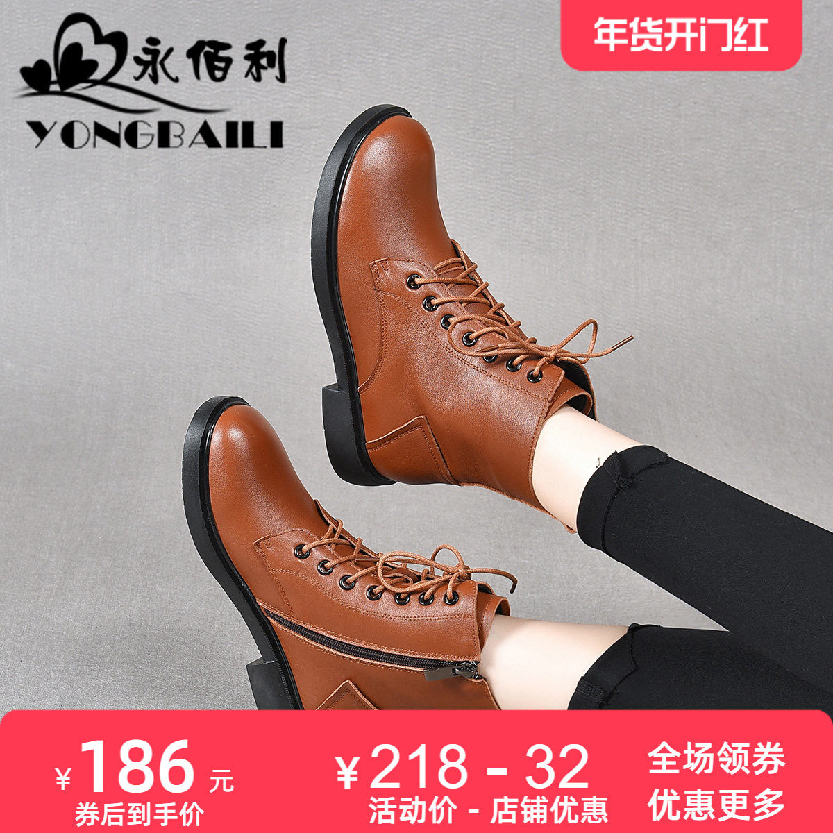 - 系带短靴粗跟马丁靴女真皮