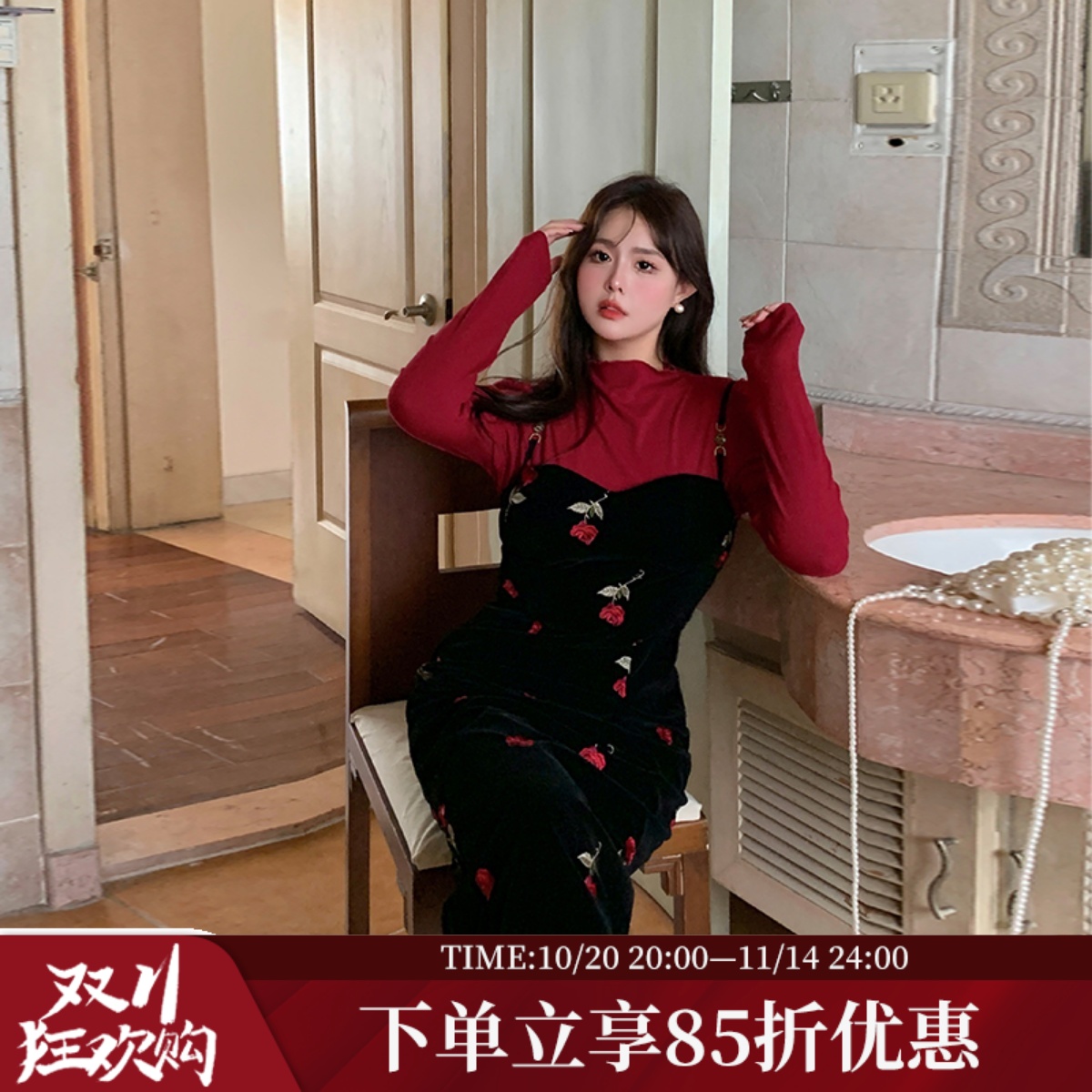 MB大码女装【玫瑰庄园】刺绣丝绒连衣裙女两件套复古吊带包臀裙子