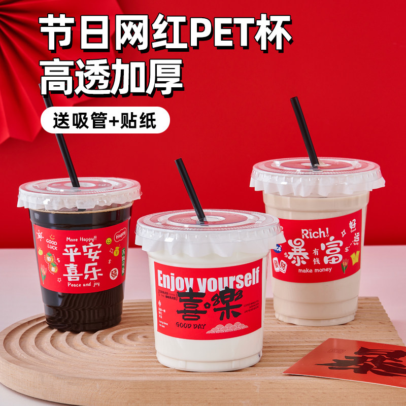 红色喜庆带盖PET杯一次性加厚高透咖啡奶茶饮料塑杯新年春节贴纸