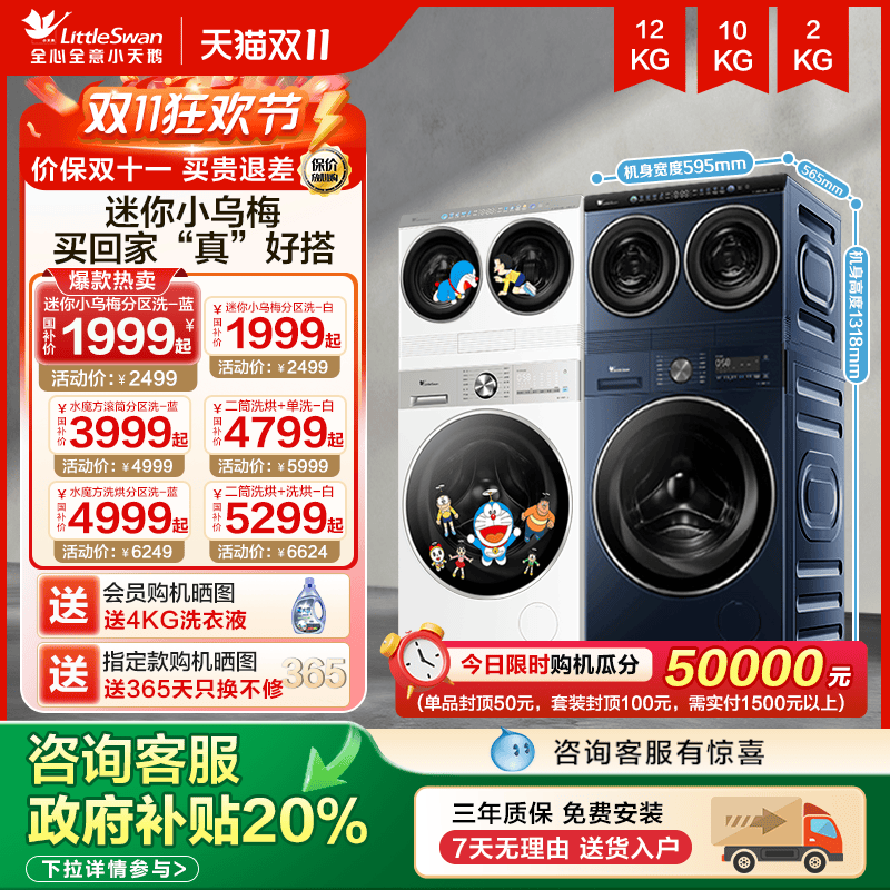 [水魔方]小天鹅迷你小乌梅懒人双筒三筒2/12/10KG滚筒小型洗衣机