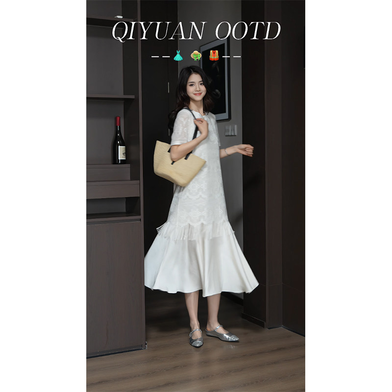 柒院家大码女暗花流苏拼接蕾丝短袖连衣裙2026夏季宽松鱼尾中长裙
