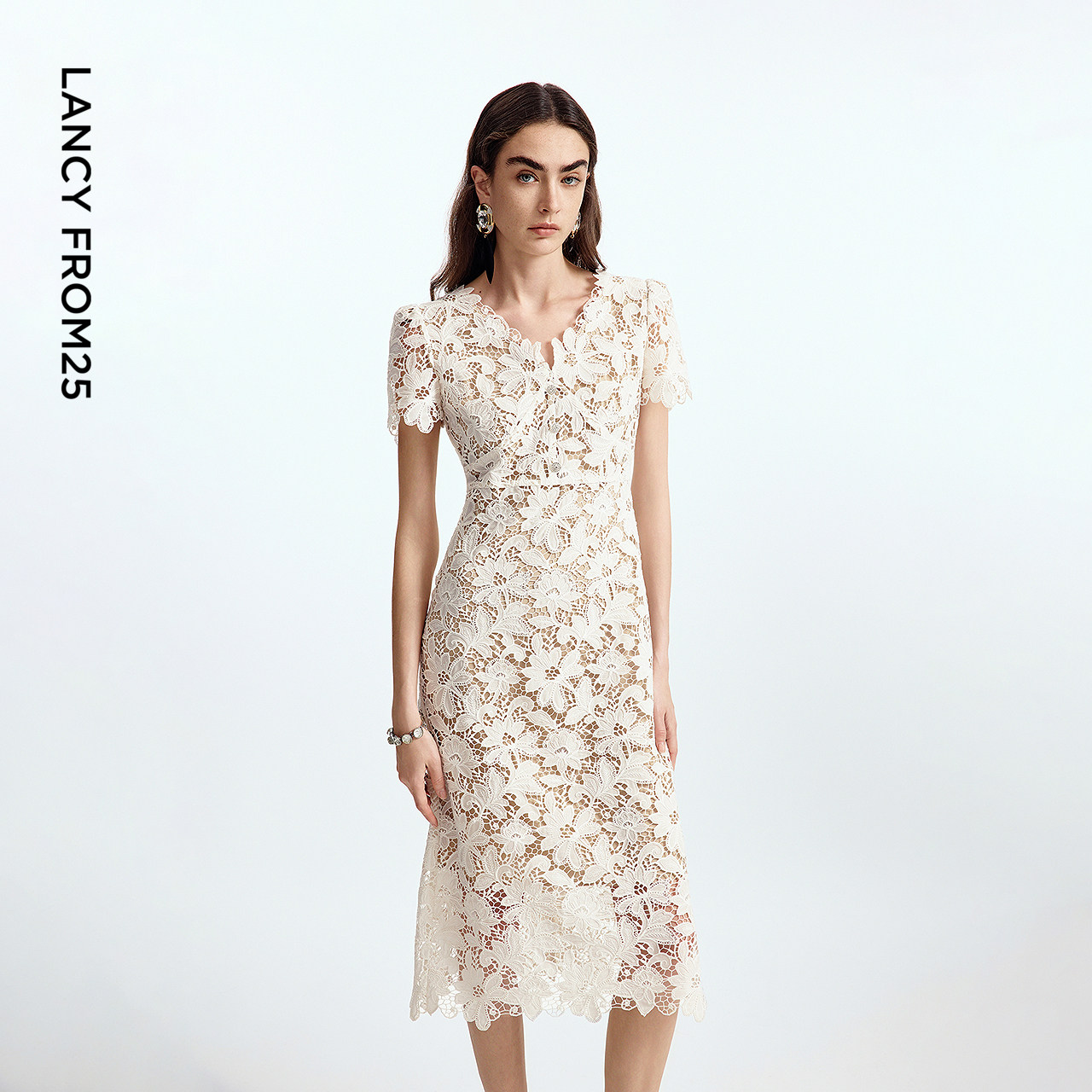 朗姿25气质V领修身蕾丝收腰镂空时尚中长款轻礼服秋季新款连衣裙