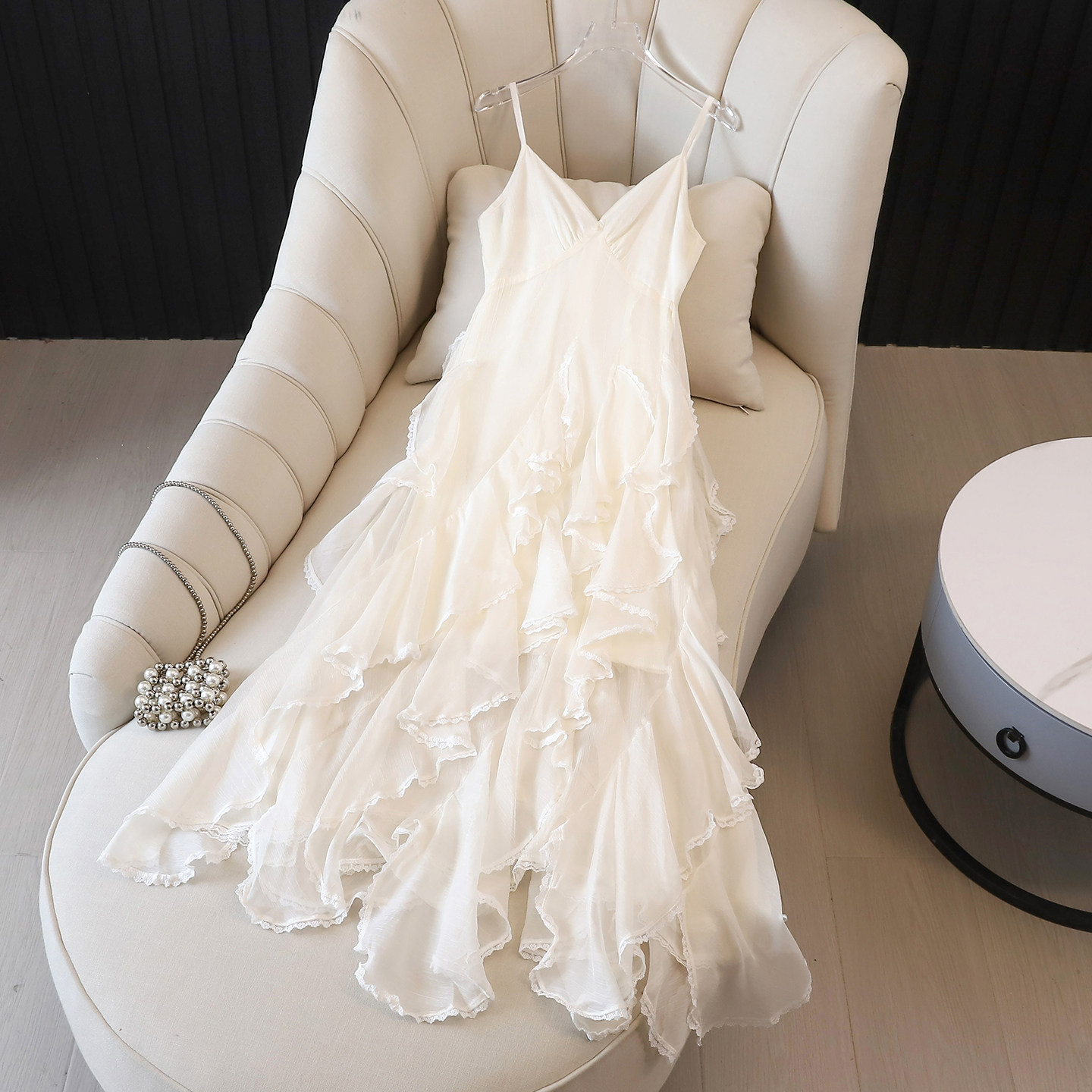 AZure法式复古蕾丝雪纺拼接不规则吊带连衣裙轻盈感荷叶边中长裙