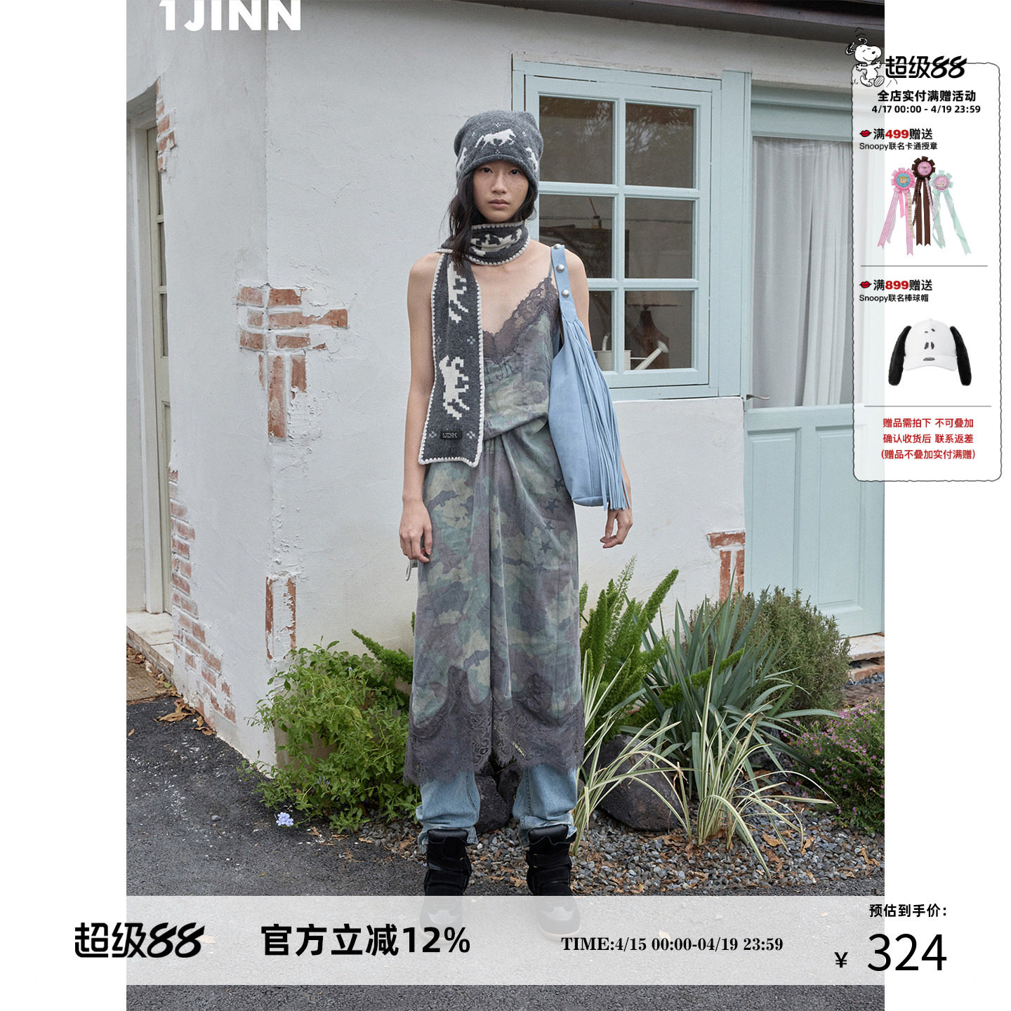 1JINN STUDIO 迷彩印花蕾丝拼接V领连衣裙女中长款网纱辣妹吊带裙