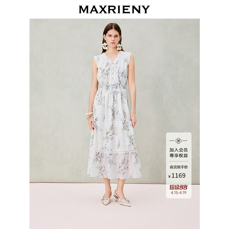 MAXRIENY植物印花连衣裙2026夏季新款小飞袖中长款蕾丝花边裙子