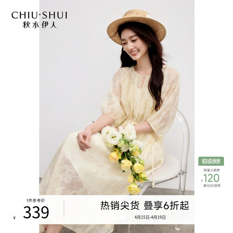 LULUALWAYS我爱露露24春季新款温柔淑女提花拼接蕾丝中长款连衣裙