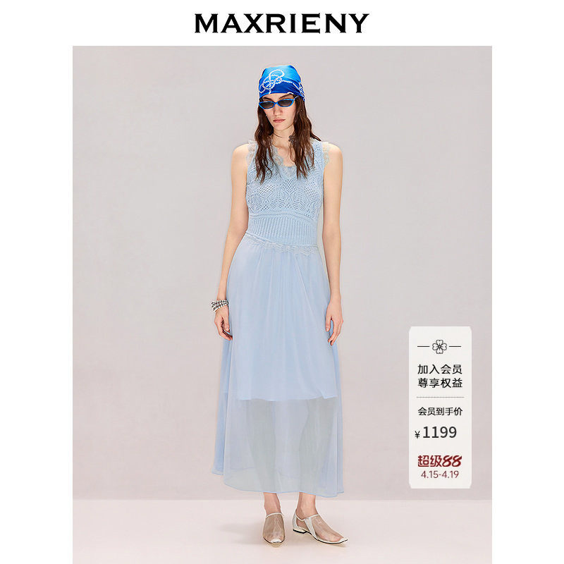 MAXRIENY雾蓝色针织拼接连衣裙2026年夏季新款无袖中长款蕾丝裙子