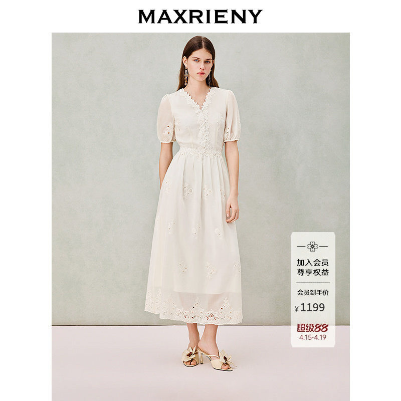 MAXRIENY春季连衣裙中长款2026年新款蕾丝短袖收腰V领米白色裙子