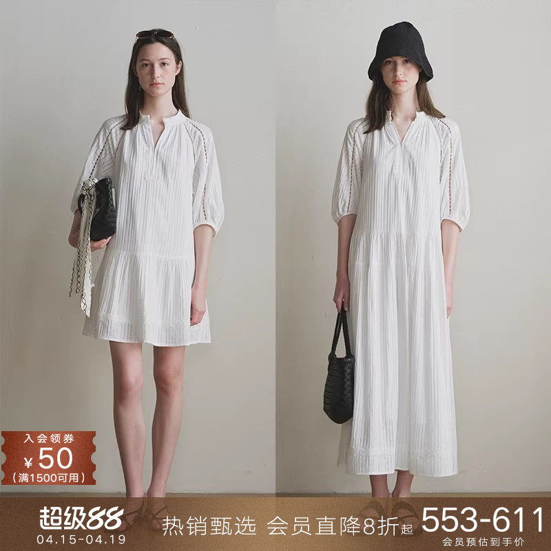 popchrio◆别致镂空蕾丝泡泡半中袖连衣裙度假风白色中长短裙子女