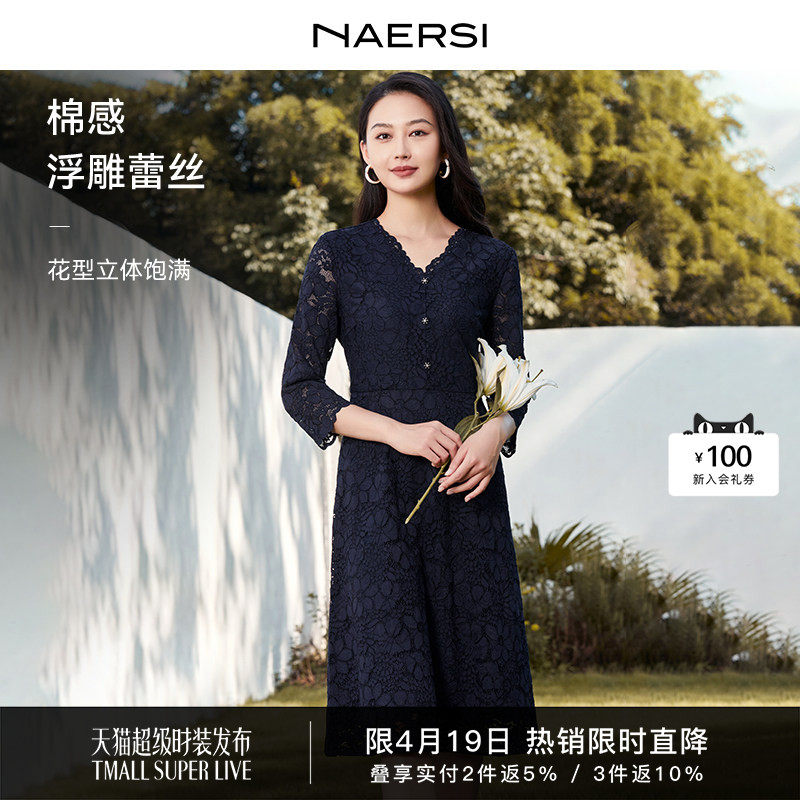 【浮雕蕾丝】NAERSI娜尔思气质V领连衣裙女春秋季七分袖中长裙