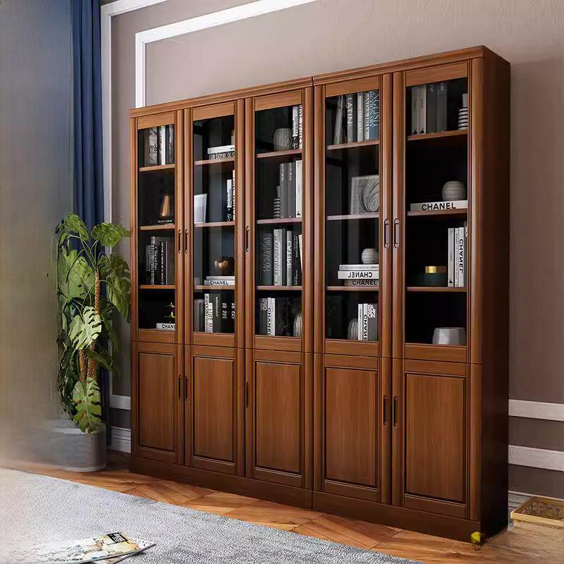 全实木书柜储物柜一体靠墙落地带玻璃柜门防尘书架置物柜客厅橡木