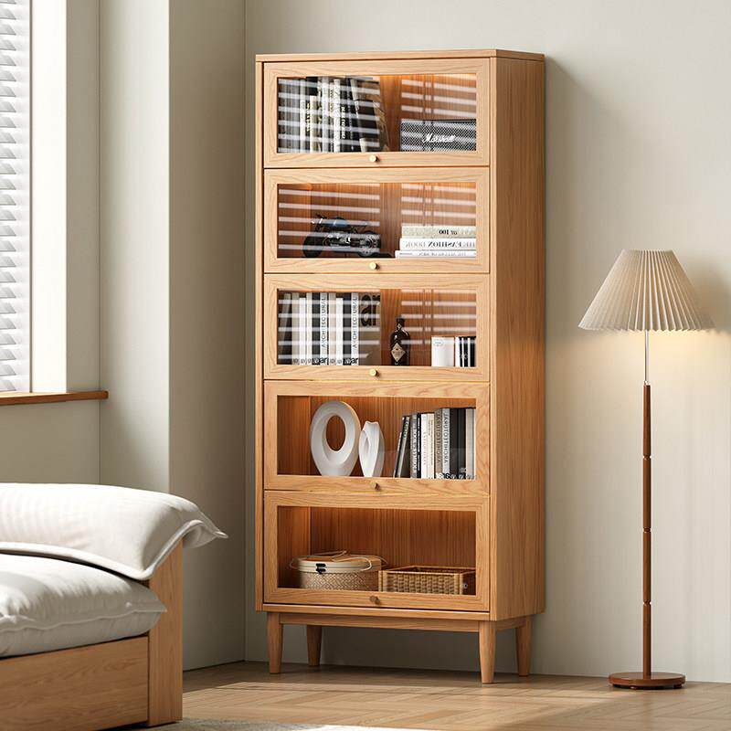 全实木橡木书柜上翻柜门带玻璃置物架落地原木风家用儿童书房书架
