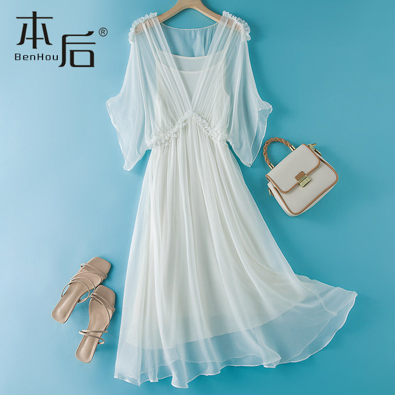 真丝桑蚕丝连衣裙大码女装减龄气质显瘦高端轻奢刺绣中长款沙滩裙