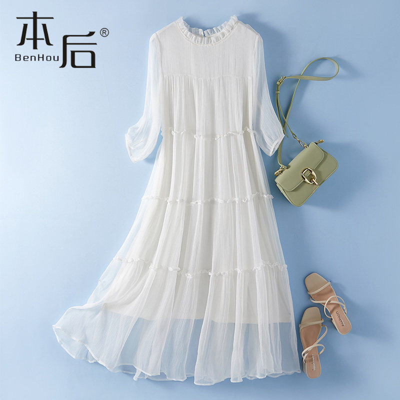 【清仓】11036 重磅真丝连衣裙夏女中长款气质高腰桑蚕度假沙滩裙
