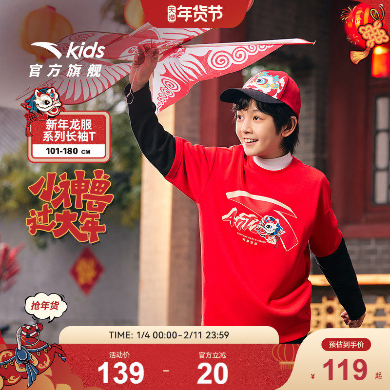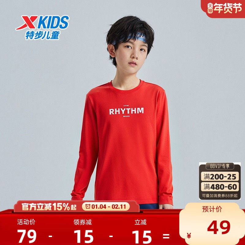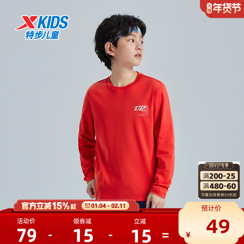 特步童装秋冬新款儿童运动长T男童圆领长袖T恤中大童纯棉红色上衣