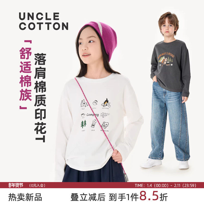 【舒适棉族】棉叔叔女童落肩棉质长袖T恤秋新款廓形舒适男童长T恤