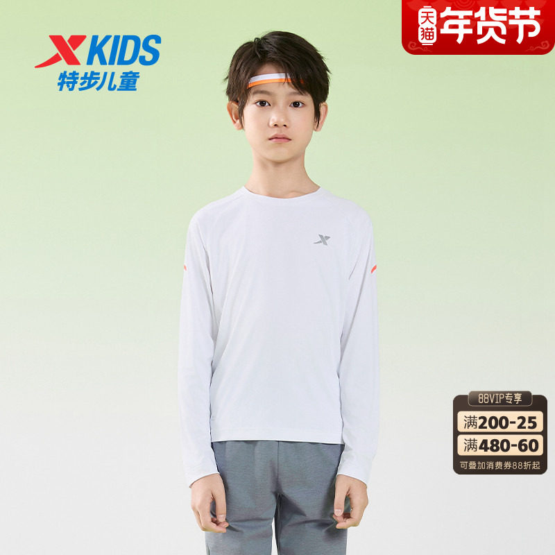 特步童装男童速干长袖T恤春季新款儿童圆领套头上衣中大童运动长T