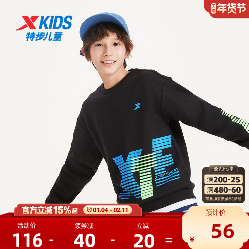 特步童装男童印花卫衣2025秋冬季儿童长t恤衣服运动加绒上衣大童
