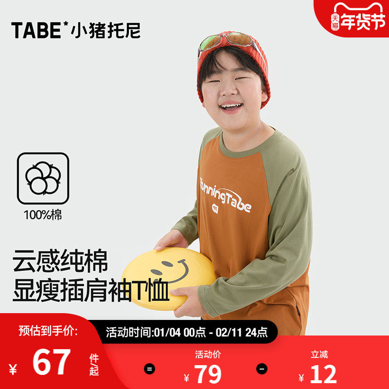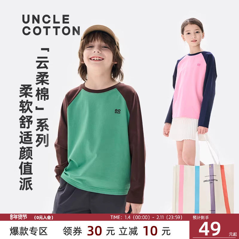 棉叔叔女儿童撞色长袖T恤男童秋冬云柔棉宽松修身插肩袖印花长T