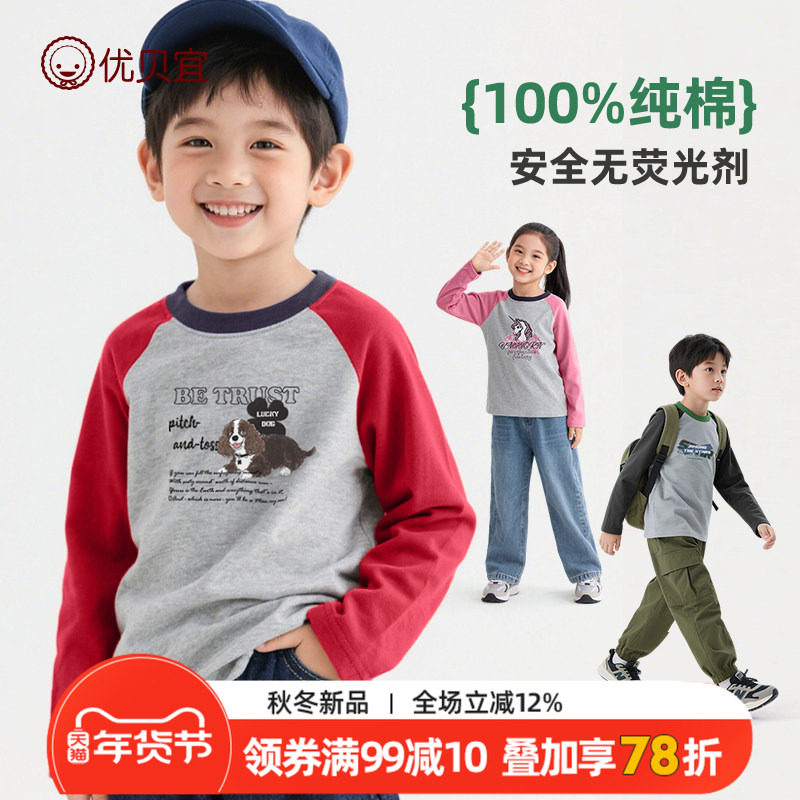 优贝宜儿童长袖纯棉T恤2025春季新款男童打底衫女童上衣中大童长t
