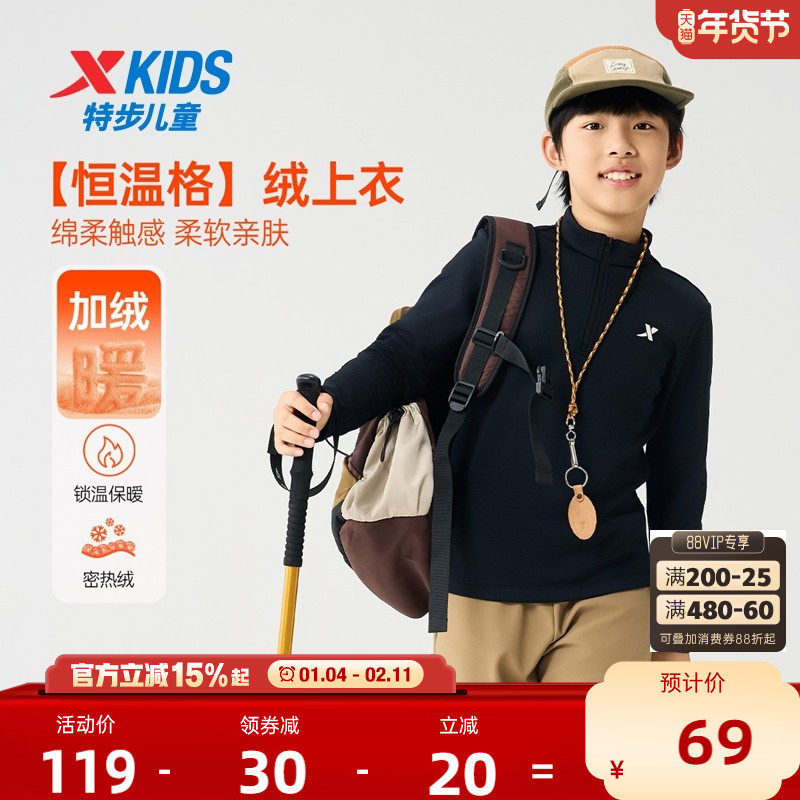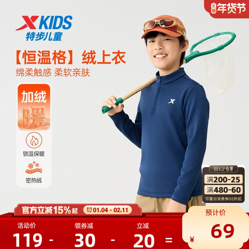 特步童装2025年秋冬男童长袖T恤儿童加绒上衣中大童运动半开襟长t