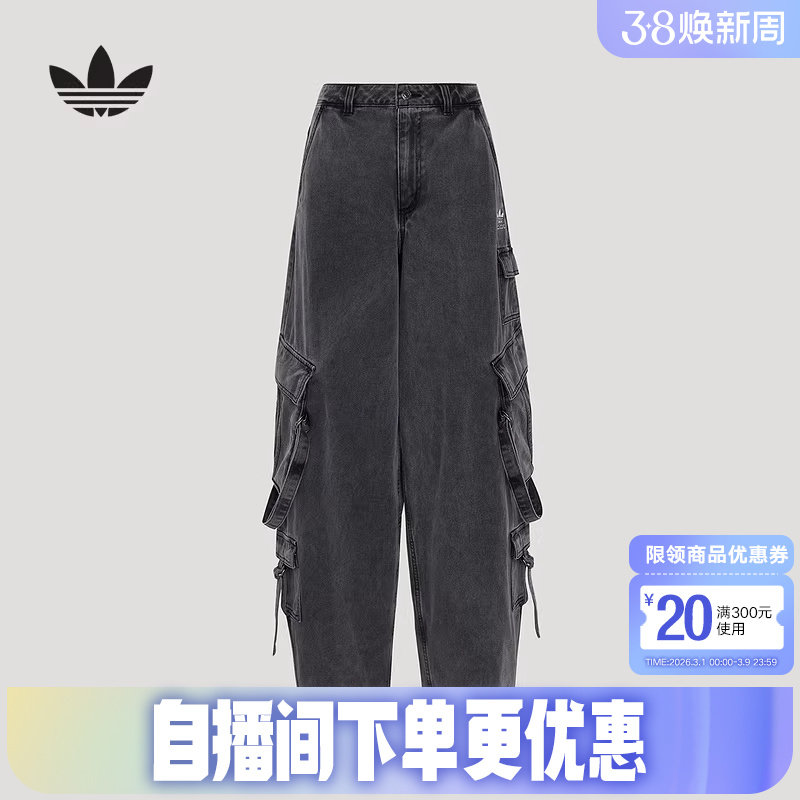 阿迪达斯三叶草女裤2026春季新款工装风牛仔多口袋直筒长裤KU9535