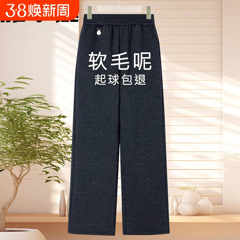 2025秋冬新女裤妈妈直筒毛呢休闲长裤高腰松紧加绒加厚中老年阔腿