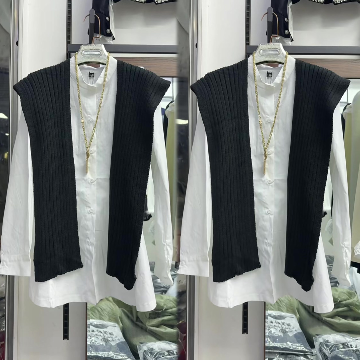 立领中长款白衬衫女+针织披肩2025冬季新款韩系时尚穿搭网红上衣