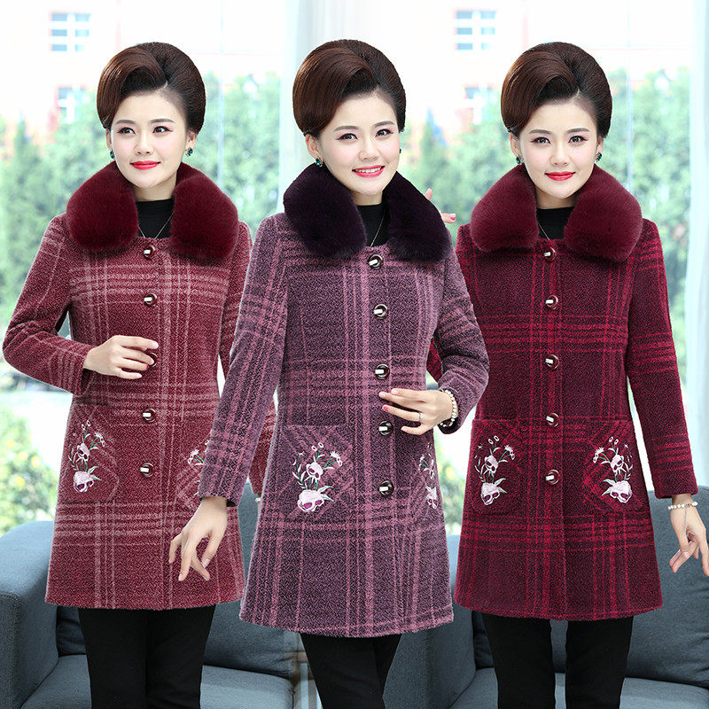 中年妈妈洋气毛呢大衣冬装加绒加厚新款中老年人女秋冬季格子外套