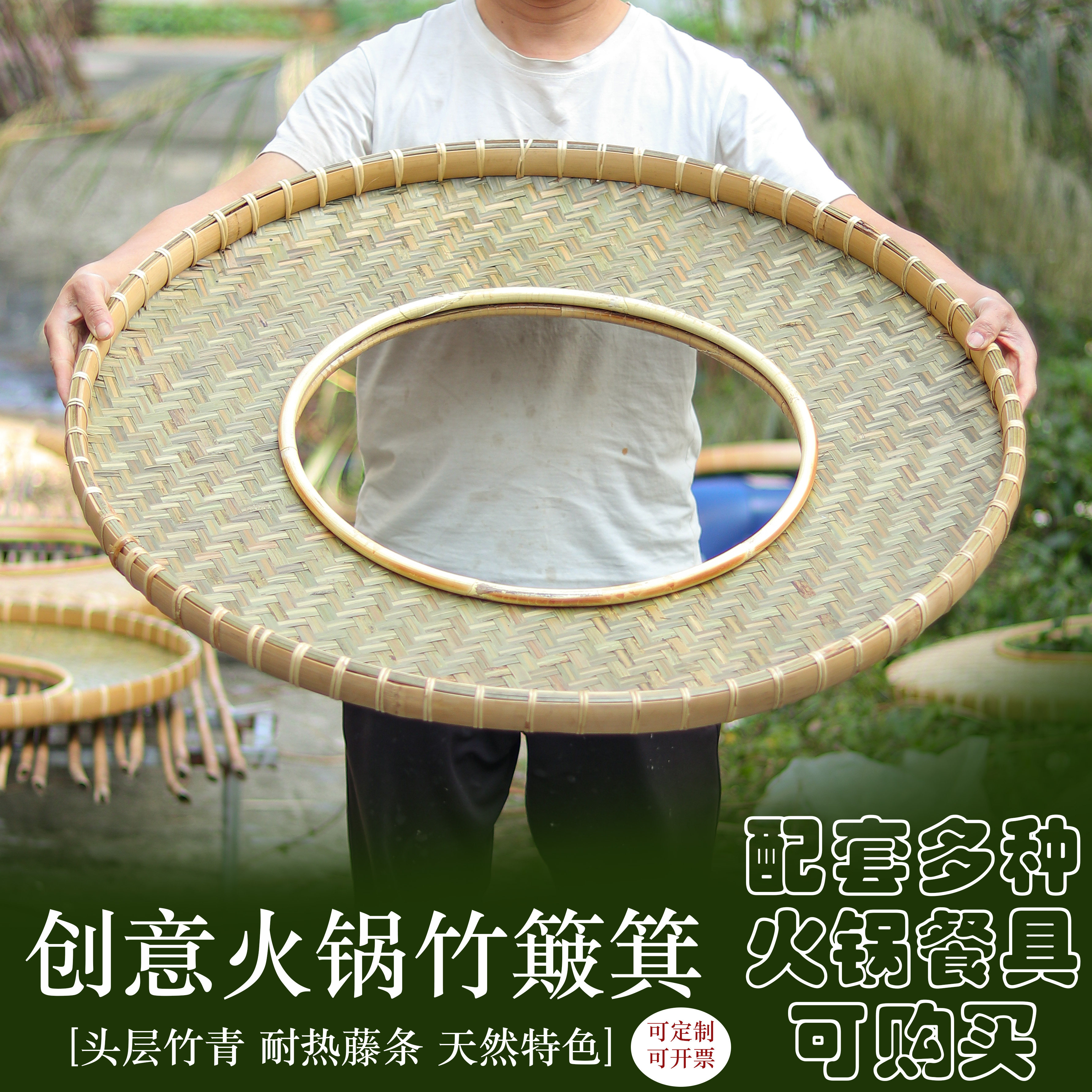 圆形簸箕宴竹篮打火锅特色农庄饭店摆拼盘餐具牛羊肉竹制菜盘空心