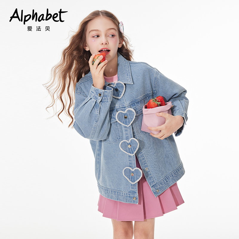 2025爱法贝新款春秋女童牛仔外套爱心扣设计百搭外套牛仔上衣