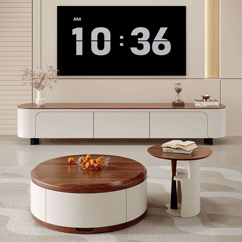 奶油风实木圆形茶几组合客厅家用2024新款轻奢简约现代茶几电视柜