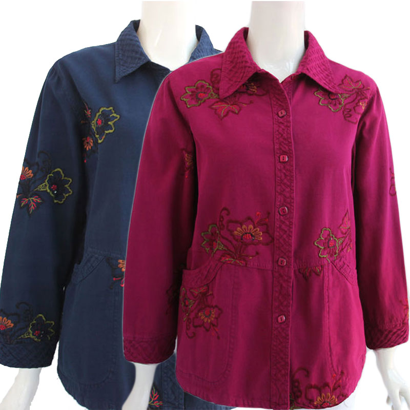 纯棉中老年女春秋装衬衫大码妈妈奶奶装九分袖刺绣衬衣开衫民族风
