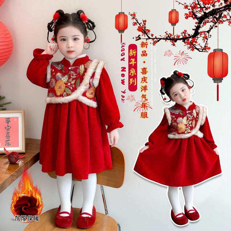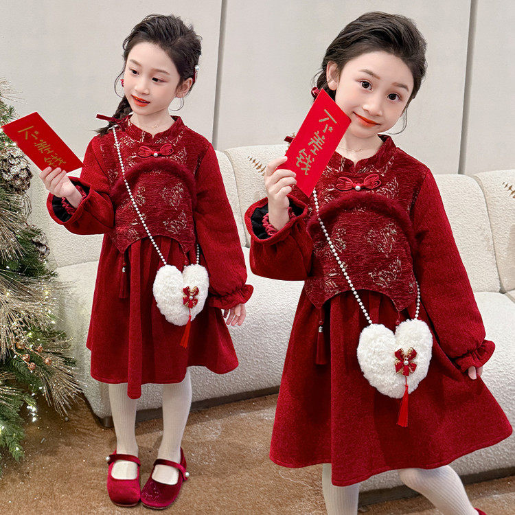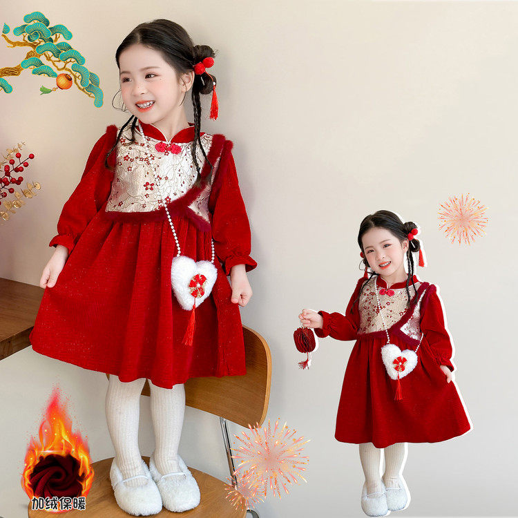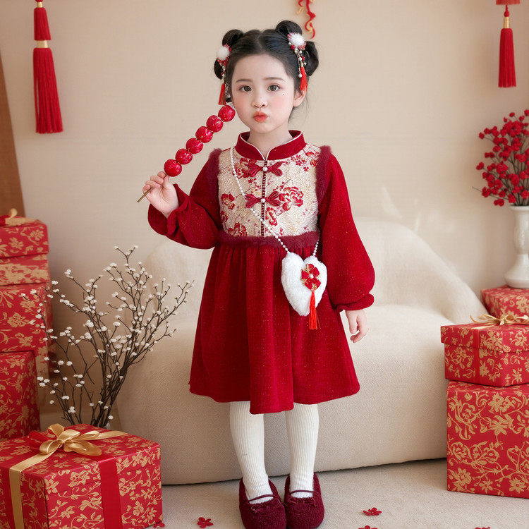 红色新中式礼服公主裙女童秋冬旗袍裙小女孩新年服儿童国风连衣裙