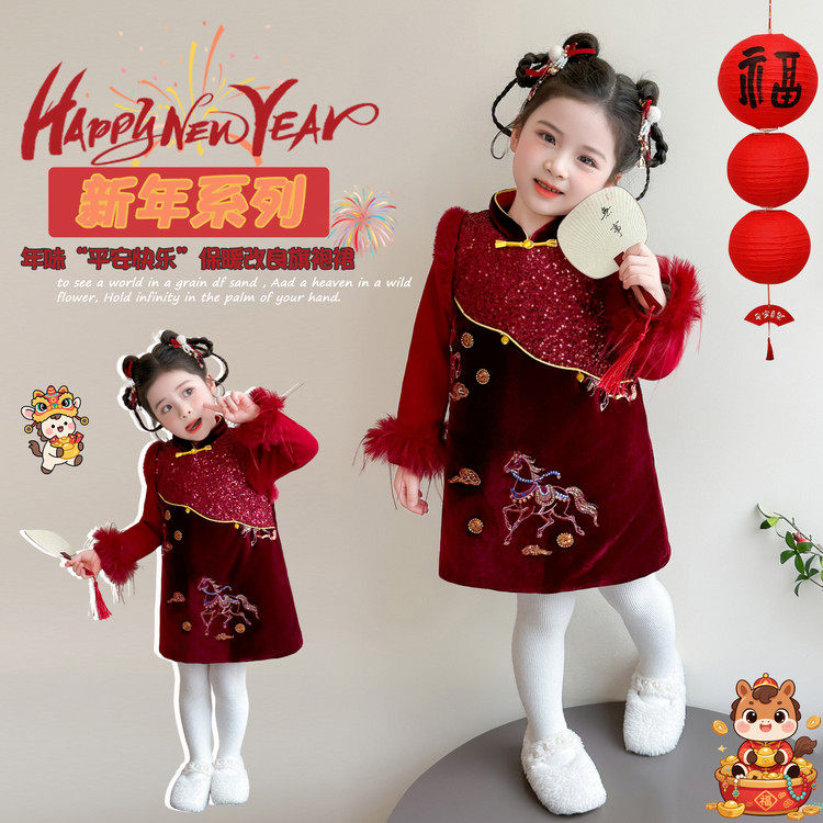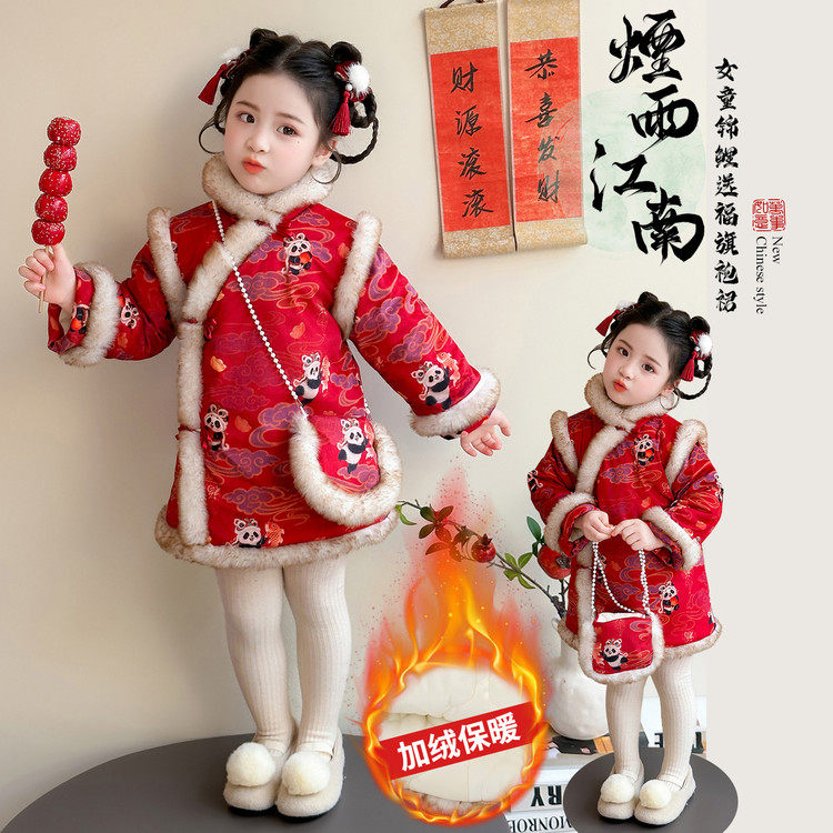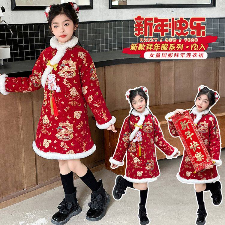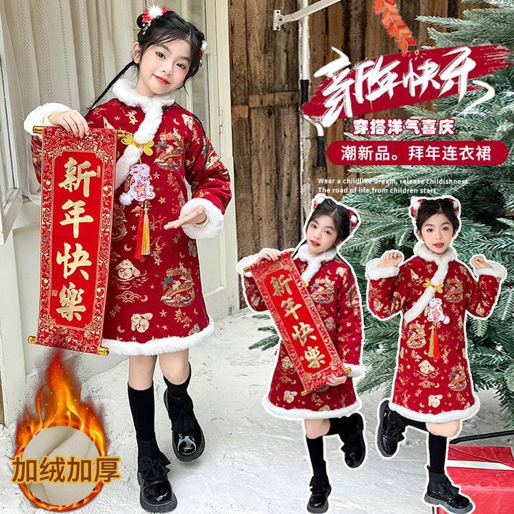 儿童汉服女童拜年服加厚洋气中国风唐装日常喜庆年服秋冬旗袍裙子